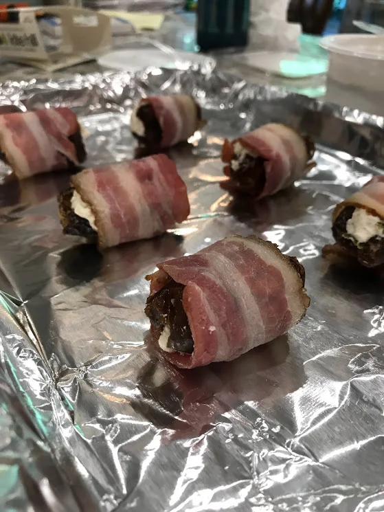- Wrap each date in half a slice of bacon and place, seam side down, on the baking sheet from the bacon