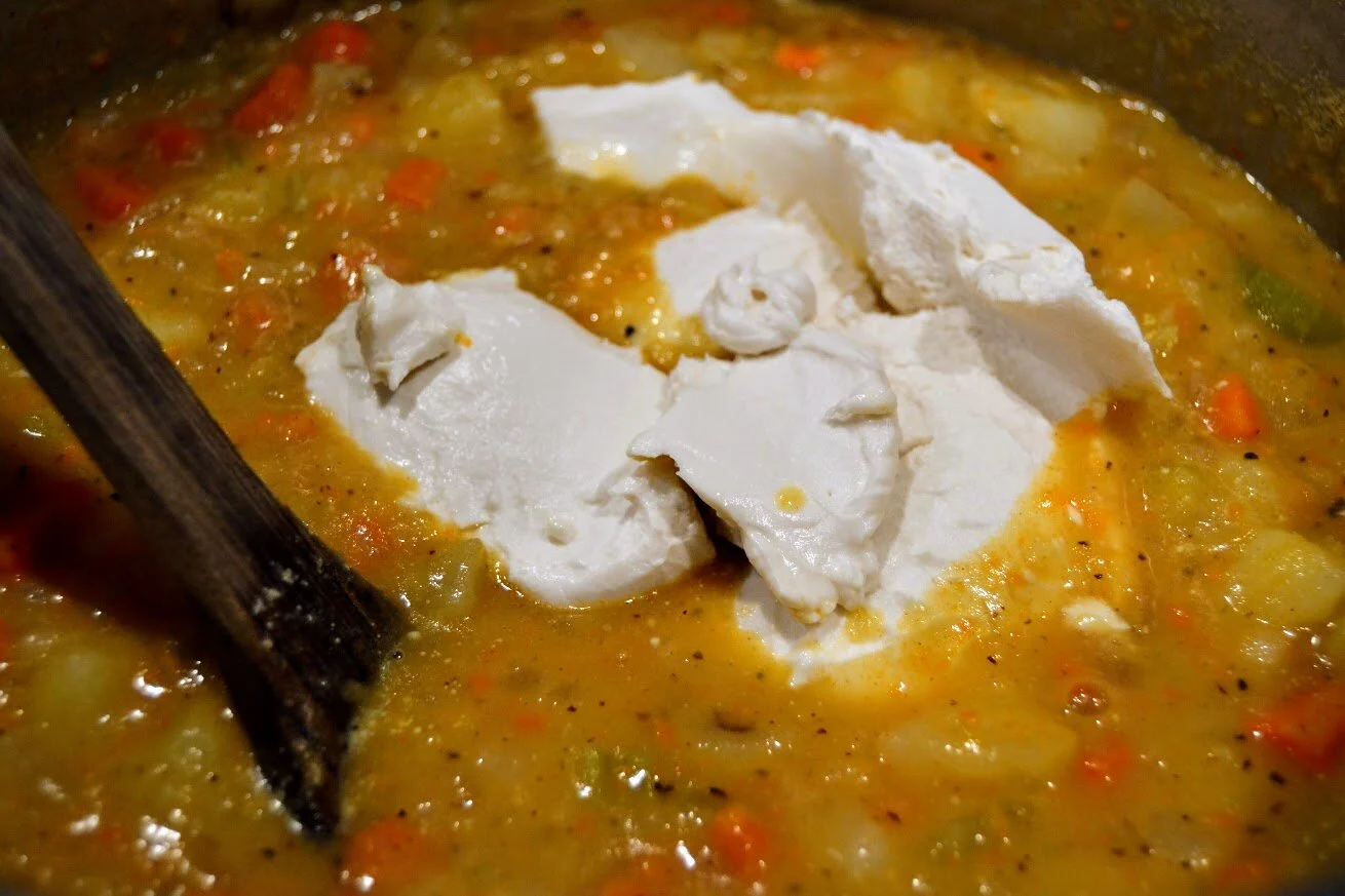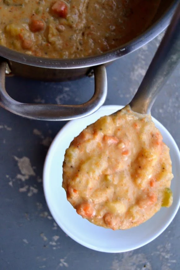Now bust out a potato masher or an immersion blender and puree some of the soup. You don’t want to over-do it because those chunks add such great texture. Doing this will thicken the soup naturally too.
