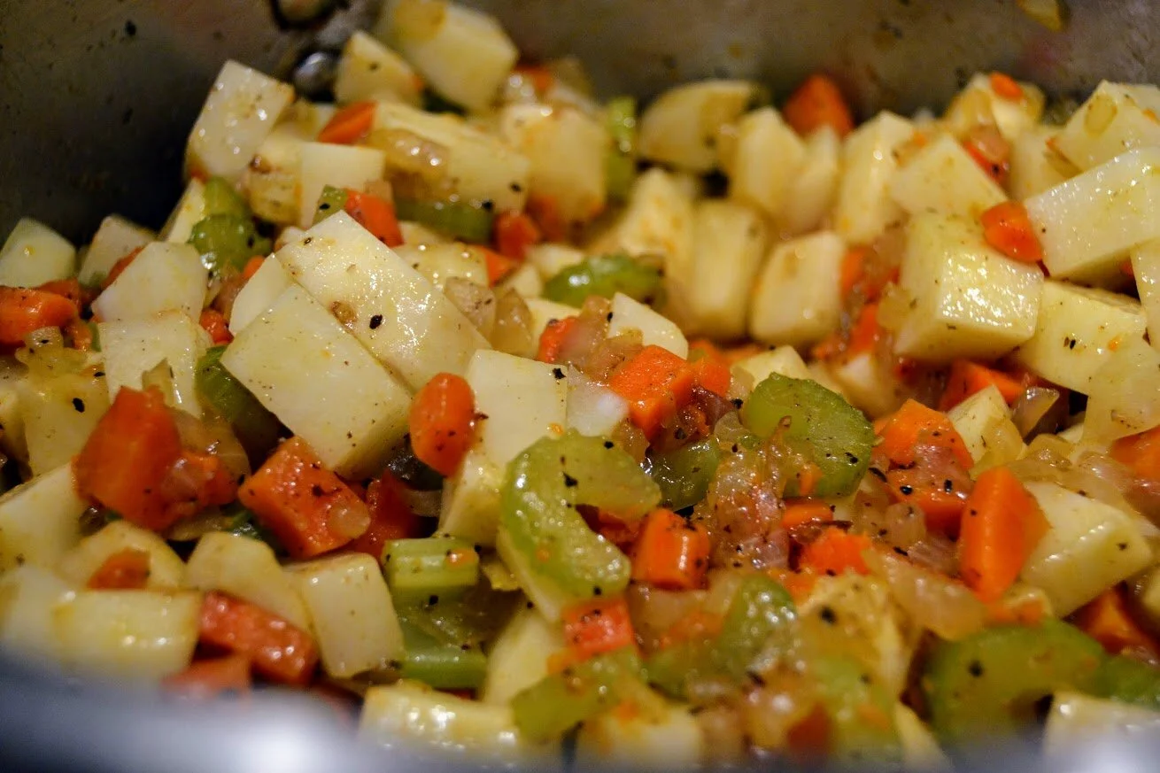 - To the pot, add onions, celery, carrots, salt, and pepper; cook until softened and slightly browned. Add the potatoes or cauliflower and stir in the pot for a minute.