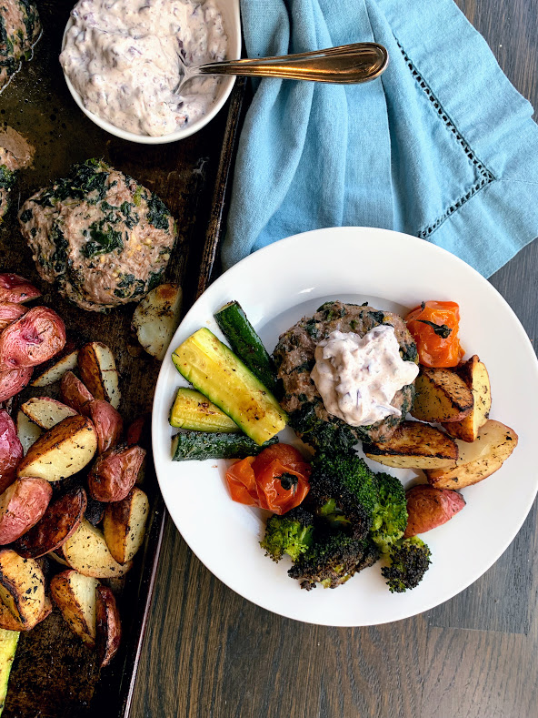 - Preheat the oven to 425. In a bowl, mix the lamb with the spinach, garlic, oregano, zest of one lemon, 1 teaspoon salt and 1/2 teaspoon pepper. Form into 4 patties and make a slight indent in the center, set aside.