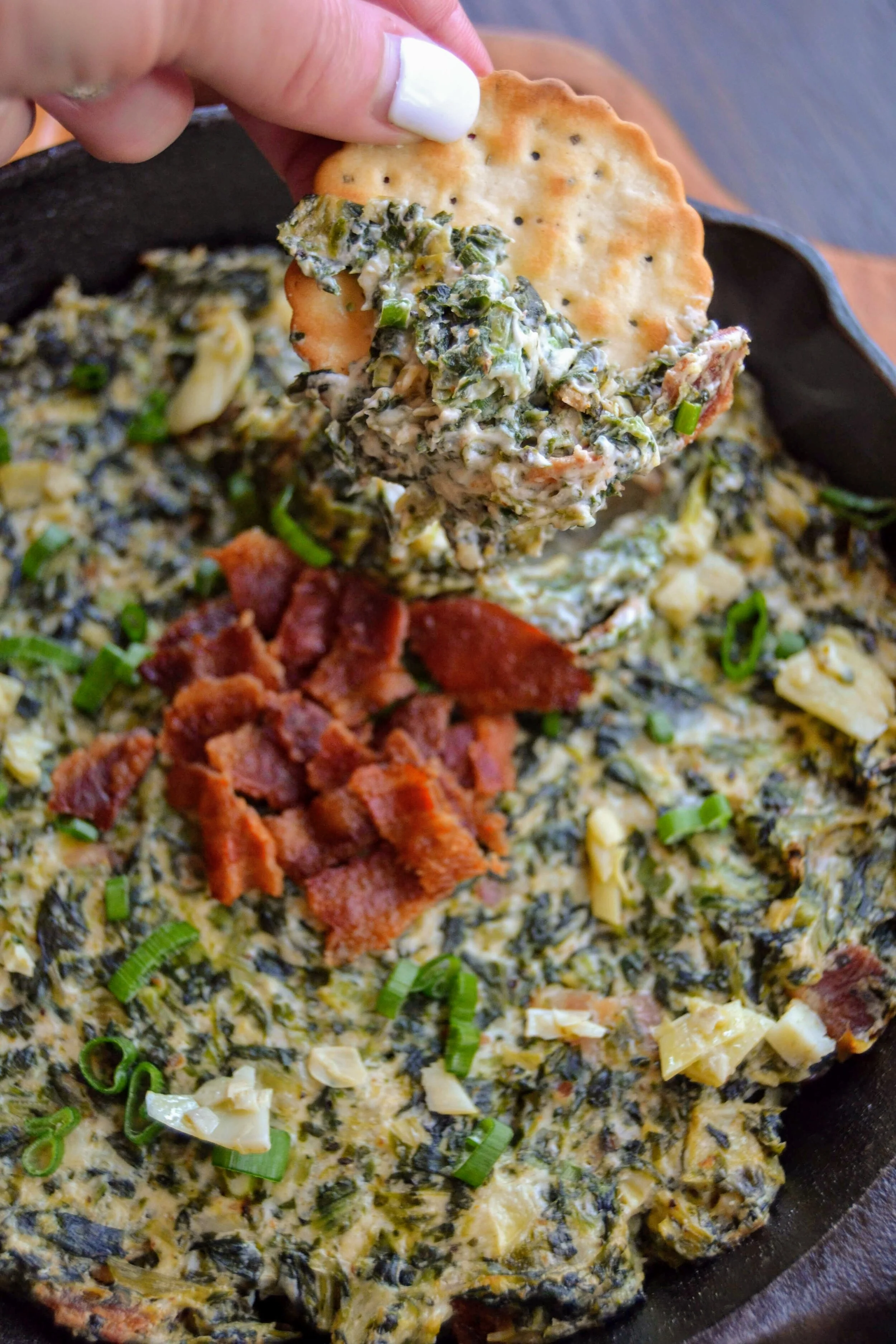 Spinach and artichoke dip is a classic for a reason, its delicious and makes people think it is a little healthier with those leafy greens. Why not bump it up a notch and add some glorious bacon plus a spin of dairy free? This dip is super simple to whip together and have come out warm from the oven, your cracker or chip will be loaded with this goodness. Have some vegan friends coming over, totally a cinch to make this a plant-based wonder. Paleo, make it with nut-based cheese and dip your celery or mini peppers. So grab some greens and let’s make this bad boy.
